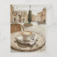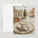 This charming postcard illustration captures a serene Roman street bathed in warm light, featuring a classic cappuccino on a café table with historic architecture in the background. The watercolor style and soft earthy tones evoke the elegance and timeless beauty of Italy, making it perfect for lovers of travel, coffee culture, and vintage European scenes.