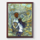 An art design of a girl and boy holding hands walking in the woods.