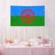 This design features the Romani flag, which is the international flag of the Romani people. The flag consists of a background of blue and green, representing the heavens and earth, respectively; it also contains a 16-spoke red chakra, or cartwheel, in the center, which represents the itinerant tradition of the Romani people and is also an homage to the flag of India. The flag was approved by the representatives of various Romani communities at the first World Romani Congress (WRC), held in Orpington in 1971.
