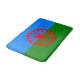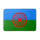 This design features the Romani flag, which is the international flag of the Romani people. The flag consists of a background of blue and green, representing the heavens and earth, respectively; it also contains a 16-spoke red chakra, or cartwheel, in the center, which represents the itinerant tradition of the Romani people and is also an homage to the flag of India. The flag was approved by the representatives of various Romani communities at the first World Romani Congress (WRC), held in Orpington in 1971.