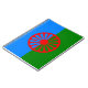 This design features the Romani flag, which is the international flag of the Romani people. The flag consists of a background of blue and green, representing the heavens and earth, respectively; it also contains a 16-spoke red chakra, or cartwheel, in the center, which represents the itinerant tradition of the Romani people and is also an homage to the flag of India. The flag was approved by the representatives of various Romani communities at the first World Romani Congress (WRC), held in Orpington in 1971.