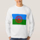 This design features the Romani flag, which is the international flag of the Romani people. The flag consists of a background of blue and green, representing the heavens and earth, respectively; it also contains a 16-spoke red chakra, or cartwheel, in the center, which represents the itinerant tradition of the Romani people and is also an homage to the flag of India. The flag was approved by the representatives of various Romani communities at the first World Romani Congress (WRC), held in Orpington in 1971.