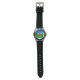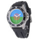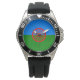 This design features the Romani flag, which is the international flag of the Romani people. The flag consists of a background of blue and green, representing the heavens and earth, respectively; it also contains a 16-spoke red chakra, or cartwheel, in the center, which represents the itinerant tradition of the Romani people and is also an homage to the flag of India. The flag was approved by the representatives of various Romani communities at the first World Romani Congress (WRC), held in Orpington in 1971.