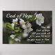 Inspirational scripture poster depicts a branch of beautiful white spring flowers with a black background. It features Bible Verse Romans 15:13, "May the God of hope fill you with all JOY and PEACE as you trust in Him."-