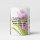 This pillar candle features a laries script print font with black letters showcasing the "Romans 15:5 KJV" bible scripture verse over a background picture displaying a set of pink roses with green stems and petals in this floral theme. This verse is referencing the Book Of Romans 15th chapter showing the 5th verse in this bible scripture quote theme from the King James bible. The candle is covered with a beautiful full-color wrap hand poured, individually designed made with high grade American paraffin & beeswax and, burns approximately 40 hours made in the USA.