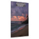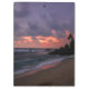 The fading sunlight creating beautiful pink and orange hues in the sky, making silhouettes of the palm trees and highlighting the gentle surf. Tranquil beach scene.
