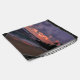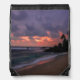 The fading sunlight creating beautiful pink and orange hues in the sky, making silhouettes of the palm trees and highlighting the gentle surf. Tranquil beach scene.