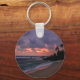 The fading sunlight creating beautiful pink and orange hues in the sky, making silhouettes of the palm trees and highlighting the gentle surf. Tranquil beach scene.