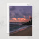 The fading sunlight creating beautiful pink and orange hues in the sky, making silhouettes of the palm trees and highlighting the gentle surf. Tranquil beach scene.