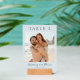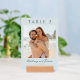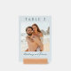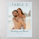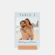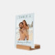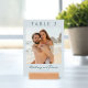 This wedding table card features a romantic beach scene with a central photograph of two individuals embracing, surrounded by soft pastel tones and natural lighting. The design includes elegant typography with "TABLE 2" in bold uppercase letters at the top and customizable script font for names below the image, creating a personalized touch. The serene atmosphere evokes warmth and intimacy, perfect for setting a tranquil mood at your special event. Ideal for weddings or anniversary celebrations, this card combines realistic representation with a casual yet sophisticated style.