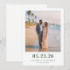 This wedding save the date features a romantic beach scene with two individuals standing close together, facing each other on a sandy shore. The color palette includes warm tones of sandy beige, light blue, and soft pink, creating a serene and tropical atmosphere. The design is photographic, capturing natural beauty with clarity and detail, while the typography uses a classic serif font for a timeless touch. Perfect for setting the tone for a beach-themed wedding, this design evokes feelings of love and tranquility.