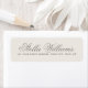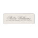 Elegant return address labels with your name in an elegant calligraphy script font and the address below. Light brown text on a pale beige background.