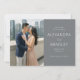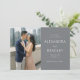 This wedding save-the-date card features a balanced layout with a romantic photograph on the left, capturing an intimate moment between two individuals against a cityscape backdrop. The right side showcases clean, modern typography on a neutral gray background, highlighting the couple's names in elegant serif font and providing essential details in a sans-serif style. The color palette includes soft blues, warm beige, and muted grays, creating a sophisticated and contemporary aesthetic. Perfect for setting the tone for a formal celebration, this design blends personal imagery with structured text to convey warmth and sophistication.