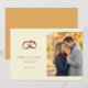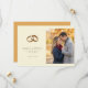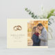 This wedding save the date features a split layout with elegant gold wedding bands on one side and a cozy autumn photo of a couple embracing on the other. The design uses a soft earthy color palette, including beige, gold, brown, and muted greens, creating a warm and romantic atmosphere. The typography is clean and classic, enhancing the overall theme of timeless elegance. Perfect for couples looking to set a tender and intimate tone for their upcoming nuptials, this template combines modern minimalism with heartfelt imagery.