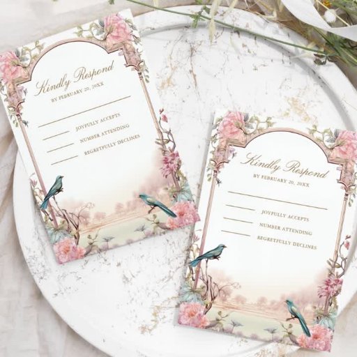 Elegant wedding RSVP card featuring beautiful flowers and cute birds.