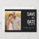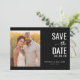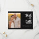 This wedding save the date card features a split design with a warm, romantic photo of two individuals against a backdrop of yellow flowers on one side and elegant text elements on a solid black background. The color palette transitions from soft yellows and oranges to deep black, creating an intimate atmosphere. The typography combines bold serif fonts for "SAVE the DATE" with cursive script for added personal touch, while customizable placeholder text allows for easy personalization. The overall layout is balanced and centered, emphasizing clarity and simplicity, making it perfect for formal occasions.