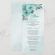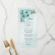 Unique wedding menu card featuring romantic blue flowers and green leaves.