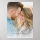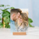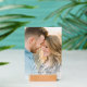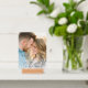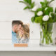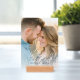 This wedding table card features a romantic photograph of two individuals with their foreheads gently touching, creating an intimate and warm atmosphere. The design uses a soft color palette with natural tones, including warm beige and soft blue, complemented by floral patterns in pink, white, and green. Elegant script typography at the bottom reads "table 12" followed by names in capital letters, adding a personalized touch to the overall composition. The layout is centered with ample negative space, emphasizing the connection between the subjects, while the realistic yet dreamy art technique enhances the heartfelt mood, making it perfect for celebrating love on your special day.