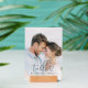 This wedding table card features a tender moment between two individuals, set against a softly blurred beach backdrop that evokes serenity and romance. The design uses a gentle color palette of light blues, whites, and warm skin tones to create an inviting atmosphere. Elegant cursive typography highlights the table number, while clean sans-serif text adds sophistication. Perfect for adding a personal touch to your wedding reception, this card captures the joy and connection of love in a contemporary, candid style.