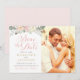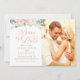 A soft and romantic save the date featuring a delicate blush and ivory watercolor floral bouquet alongside a portrait engagement photo in a split-panel layout. Rose gold and blush script lettering adds a warm, feminine elegance perfect for spring or garden weddings. All text including names, date, location, and website is fully customizable.