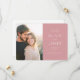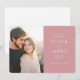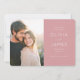 This wedding save the date card features a split design with a warm, soft-focus photograph on the left and a solid blush pink background on the right. The layout is balanced and elegant, with centered typography that includes bold sans-serif names and classic serif fonts for additional details. The color palette combines earthy tones from the photo with a romantic pink hue, creating an inviting and intimate mood perfect for celebrating a special occasion.