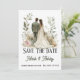 Announce your special day with this stunning Save The Date card featuring a warm botanical scene and a romantic bride-and-groom illustration.