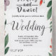 This elegant watercolor floral wedding invitation is perfect for a modern wedding. The romantic design features a sleek watercolor floral frame with a bride and groom illustration and black calligraphy on a white background.