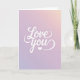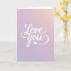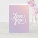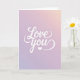 This design shows the words “Love You” in white, flowing cursive letters placed right in the center of the card. The letters are tall and smooth, and they stand out clearly against the background. Just under the word “You,” there’s a small white heart like a gentle finishing touch. Behind the message is a soft gradient that starts with peach near the top and shifts into lavender toward the bottom. The overall look feels calm and romantic, like a quiet note you’d give to someone you care about ❤️. It’s meaningful because it says a lot with just a few words, which can feel more honest and direct than a long message. Share it to pass along a little Valentine’s Day love and affection 🥰.