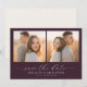 This wedding save the date features a split composition with two side-by-side photographs of a couple, capturing an intimate and romantic moment. The warm color palette includes soft beige tones for clothing and golden sunlight hues, contrasted by a deep burgundy background for the text section. Elegant script typography announces "save the date," while a simple serif font presents names and customizable details, ensuring readability and sophistication. The design exudes a mood of anticipation and elegance, perfect for setting the tone for a memorable event.