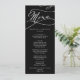 This romantic calligraphy dark black wedding dinner menu card is perfect for a simple wedding. The modern classic design features fancy swirls and whimsical flourishes with gorgeous elegant hand lettered typography. This menu can be used for a wedding reception, rehearsal dinner, or any event.