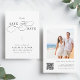 This romantic script save the date announcement card is perfect for a simple wedding. The minimalist black and white design features elegant and romantic calligraphy lettering with a QR code on the back.