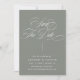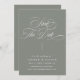 This romantic script save the date announcement card is perfect for a simple wedding. The minimalist sage green and white design features elegant and romantic calligraphy lettering with formal typography.