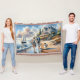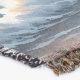 This enchanting coastal scene captures a dreamy sunset stroll along a golden shoreline, where soft waves kiss the sand and warm light dances across the water. A stylish couple walks hand in hand beside a fluffy companion, their silhouettes glowing against a pastel sky brushed with blush, apricot, and powder blue clouds. In the distance, a graceful sailboat drifts peacefully, while a grand seaside cottage rests atop a flower-lined bluff, surrounded by lush greenery and blooming garden paths. The entire composition feels like a modern cottagecore daydream infused with cozy coastal charm and a hint of boho romance. Gentle reflections shimmer in the wet sand, creating a luminous, painterly aesthetic that feels both whimsical and serene. This artwork blends soft realism with a storybook atmosphere, evoking feelings of love, tranquility, and slow living by the sea. Perfect for anyone drawn to romantic beach vibes, elegant seaside homes, and sunset wanderlust. AI generated artwork.