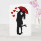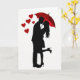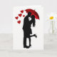 Designed with a simple black-and-white look, this card shows a couple in black silhouettes holding each other close under a bright red umbrella. The man leans in protectively, and the woman tilts toward him with long hair flowing behind her. Their faces are close, like they’re about to kiss, which makes the moment feel tender and real 🥰. One of her legs lifts slightly as she leans in, adding a sweet, happy energy to the pose. Along the left side, small red hearts float upward, like they’re drifting on the air, echoing the feeling of love spreading out. There isn’t any printed message on the front, so the picture does all the talking and leaves room for your own words inside ❤️. It feels meaningful to give because it quietly says “I’m here with you,” and it’s easy to share Valentine’s Day sentiments with someone you care about.