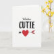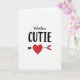 This greeting card features a white background with the word “Valentine” set near the top in smooth, flowing black lettering, followed closely by “CUTIE” in thicker black letters for contrast. Centered below the text sits a bright red heart ❤️ with gentle shading that gives it a soft, rounded look. A slim black arrow runs through the heart at a slight angle, like Cupid caught the moment right as a crush turns into something mutual 🥰. The sharp black line of the arrow against the white space keeps the scene focused and uncluttered, while still feeling intimate. The arrow’s fletching is colored the same red as the heart, echoing the main shape and tying the colors together. The overall layout is stacked and easy to read, with the message on top and the heart-and-arrow graphic placed beneath it. The heart remains centered on the page, pierced by the black arrow with red fletching that stands out against the white background.