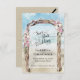 These beautiful Save the Date cards are the perfect way to let your friends and family know about your upcoming destination wedding. The artwork features a lovely pastel watercolor painting of a romantic driftwood arch with pink and white roses on a pristine tropical beach with waves, surf, and sand in the background. Features elegant script calligraphy lettering.