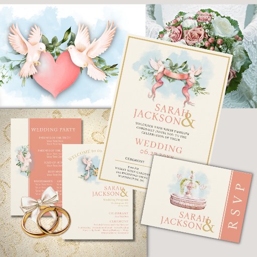 Utilize this beautiful wedding sticker on invites, thank you cards, favors, and more! Beautiful wedding doves with coral-colored accents where text is easily updated prior to placing into your shopping cart.