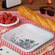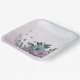 Unique paper plate featuring romantic dusty purple and blue flowers with some beautiful green leaves.