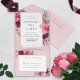 Elements: Roses and peonies on a dusty rose background. Your details are framed in a modern geometric frame. Modern sans serif fonts are used for a clean look. Colors: dusty rose, burgundy, marsala, mulberry, blush, mauve, cream, plum, green. Themes: romantic, botanical, boho, natural, enchanted garden, vintage, country. Bohemian garden. Collection: Romantic Dusty Rose Peony Modern Frame Wedding Collection. Product Type: All-In-One Wedding Invitations