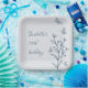 Unique simple wedding paper plate featuring romantic and elegant dusty blue flowers and butterflies on light blue background