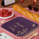 Unique simple wedding paper plate featuring romantic and elegant gold flowers and butterflies on purple background