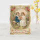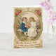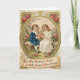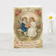 The front design shows a vintage-style garden scene framed by an embossed-looking golden oval, where two young figures sit close on a plain stone bench amid leafy greens and blooming roses 🌷. A winged boy in a deep blue suit leans forward with an earnest gaze, offering a heart-shaped gift box tied with a soft pink ribbon. Across from him, a girl in a flowing white gown with fine lace trim accepts it with a calm expression, her posture angled toward him as if sharing a quiet, affectionate moment. Around the oval frame, deep red roses and green leaves curl along the border, adding rich contrast against the gold. Near the top edge, two white doves hover with wings spread, their placement drawing the eye upward like a gentle blessing over the couple 🐇. Below the central image, a ribbon-like banner stretches across the bottom with the message “To My Dearest Love, A Gift from A True Heart” in dark lettering. The banner sits beneath the oval frame, with the gold border and clustered roses clearly visible around it.