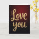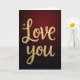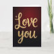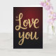 This greeting card centers on the words “Love You” in sparkling gold letters that look like they’re made from tiny glitter specks. The text sits right in the middle of the front, with smooth, flowing strokes that feel like a note written from the heart. Behind it is a dark gradient background that fades from deep burgundy at the top down to near-black at the bottom. Small star-like light flares pop across parts of the gold lettering, making it seem like the message is catching the light. The contrast between the warm gold and the moody background gives the card a cozy, romantic feel ❤️. It’s simple and direct, which makes it easy to give to a partner or someone you care about without overthinking it 🥰. Share it as a sweet way to pass along your Valentine’s Day feelings.