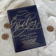 This romantic gold foil navy blue frame wedding invitation is perfect for a simple wedding. The modern classic design features fancy swirls and whimsical flourishes with gorgeous elegant hand lettered gold foil stamped typography and a formal foil frame on a dark blue background.