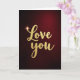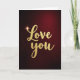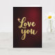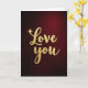 This card shows the words “Love you” in large, gold glitter letters right in the center. The lettering has a flowing, cursive look, and it stands out strongly against the dark background. Behind the text is a deep red gradient that shifts from rich burgundy in the middle to near-black around the edges. A small starburst sparkles from the start of the “L,” like a little flash of light that draws your eye. The gold texture looks speckled and shiny, like tiny reflective dots catching the light. It feels romantic and close, like a simple message you’d give when you want someone to feel cared for ❤️. Share it to help express your Valentine’s Day feelings in a kind, heartfelt way 🥰.