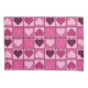 Pattern based on simple graphical hearts horizontally and vertically divided by solid colored lines. Each heart on its own square. The hearts, square backgrounds and lines all vary in colors spanning from light pink to burgund.