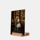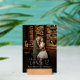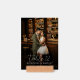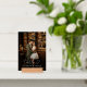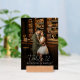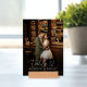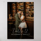 This wedding table card features a romantic scene of a couple embracing in an elegant bar setting, with warm earth tones and soft lighting creating a cozy atmosphere. The design showcases a well-stocked bar with brass lamps, adding to the sophisticated ambiance. Typography includes "Table 12" in stylish cursive script and names in clean sans-serif font, providing a personalized touch. Perfect for weddings or formal events, this card blends realism with idealized romance, making it an inviting addition to any celebration.