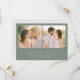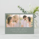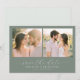 This wedding save the date design features a split composition with two rectangular photo placeholders, each capturing intimate moments between the couple. The muted greenish-gray background complements the soft pastel colors in the photos, creating an elegant and cohesive look. The cursive "save the date" text adds a touch of romance, while clean sans-serif fonts provide clarity for names and event details. The overall mood is cheerful and affectionate, perfect for announcing your special day with warmth and anticipation.