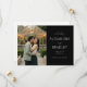 This wedding save the date features a split layout with a romantic photograph of a couple embracing in front of a warmly lit greenhouse, creating an intimate and cozy atmosphere. The right side showcases elegant text on a black background, using sophisticated serif fonts that highlight the event details. The color palette combines natural greens and browns from the foliage with warm yellow hues from the string lights, evoking a classic and timeless feel. Perfect for setting the tone for a memorable celebration, this design balances visual charm with clear communication, making it ideal for couples looking to share their special news with style.