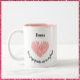 Lovely coffee/tea mug with pink-mauve heart covered in fingerprint pattern. '[NAME] Your fingerprints are on my heart" in black script lettering. PERSONALIZE with recipient's name. Great for Valentine's Day!